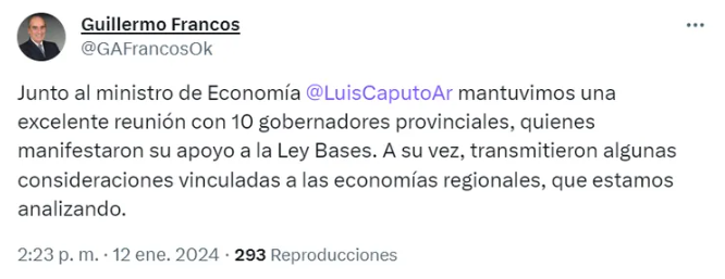 El ministro del Interior, Guillermo Francos, calificó la reunión como «excelente», destacando el respaldo manifestado por los mandatarios provinciales a la Ley Bases, aunque con ciertas consideraciones relacionadas con las economías regionales.