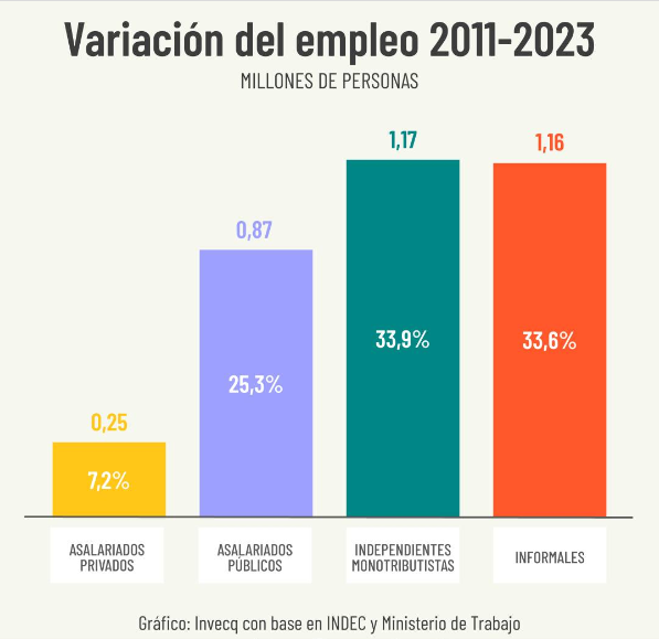 La Consultora Invecq realizó un estudio sobre el crecimiento del empleo a lo largo del tiempo en la Argentina. A partir de un análisis comparativo entre los 17.5 millones de trabajadores existentes en 2011; y los 21 millones al día de hoy, surge la pregunta de “¿Dónde se crearon los 3,5 millones de nuevos empleos en estos doce años?”. En los últimos doce años se crearon 250.000 empleos formales en el sector asalariado privado, contra 1.160.000 puestos informales, 1.170.000 monotributistas y 830.000 asalariados públicos.