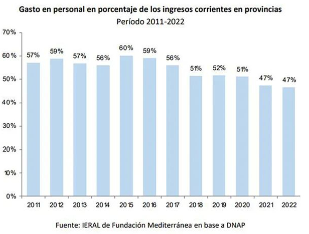 El aumento del empleo público, sin embargo, no se tradujo en una mejora del salario real de los trabajadores estatales, sino todo lo contrario. El peso del gasto en personal sobre los ingresos corrientes provinciales se redujo de 60% en 2015 a 47% en 2022, lo que implica una caída del poder adquisitivo de los empleados públicos. Asimismo, existen grandes disparidades entre las distintas jurisdicciones, tanto en el nivel como en la evolución del empleo público y privado.