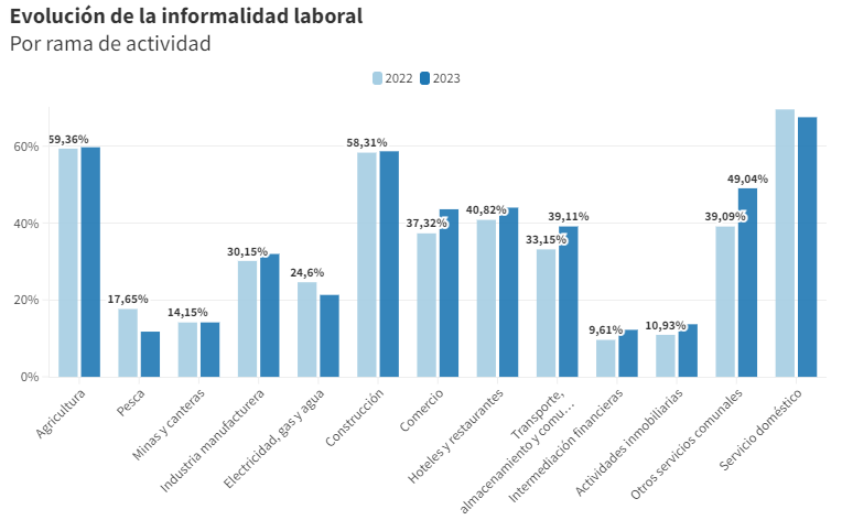 El sector que vio afectada negativamente su situación en mayor medida fue el comercio. Pasando de una tasa de informalidad laboral del 37.3% en 2019 a una del 43.5% en 2023. Se trata de un área que es de las que posee mayor demanda de mano de obra en el país.