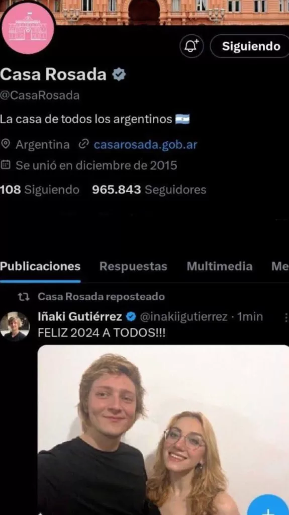 El año nuevo trajo consigo una controversia para el oficialismo. La misma se centro en el joven influencer cuyo mensaje personal para el comienzo de 2024 fue repostado desde la cuenta oficial de la Casa Rosada. La publicación original, eliminada posteriormente, expresaba buenos deseos para el nuevo año junto a una fotografía con su pareja.