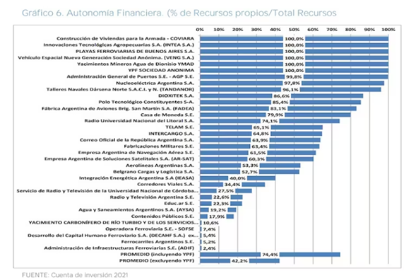En cuanto a la autonomía financiera, solo algunas de las 35 compañías pueden autoabastecerse. Las que utilizan recursos propios en un 100% son: Playas Ferroviarias de Buenos Aires, Vehículo Espacial Nueva Generación, Yacimientos Mineros Agua de Dionisio y Yacimientos Petrolíferos Fiscales. Le siguen Administración General de Puertos (99,8%), Nucleoeléctrica Argentina (97,8%) y Tandanor (96,1%).