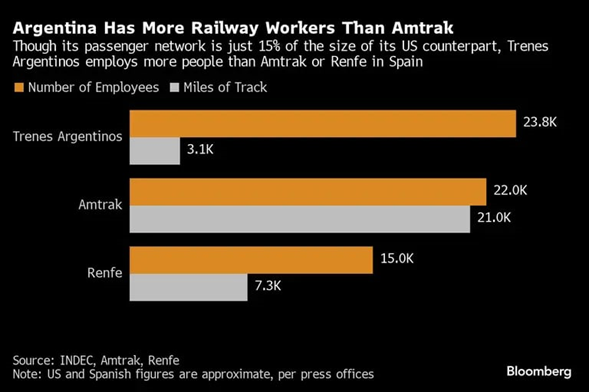 Uno de los datos más reveladores plantea que Trenes Argentinos cubre apenas el 15% del tendido ferroviario de Amtrak, que es una red interurbana de transporte de pasajeros de Estados Unidos. A pesar de ello, la compañía argentina cuenta con un número mayor de empleados estatales que la empresa norteamericana e incluso más que la red ferroviaria española de alta velocidad, Renfe.