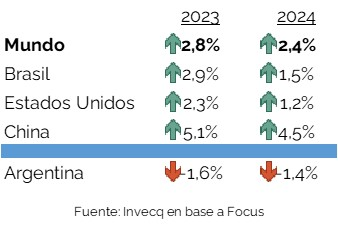 En Brasil, el exceso de lluvias en el sur y las sequías en el norte, implicarán “una caída del 1,3% en soja y más del 5% en maíz”. Por su parte, Estados Unidos verá desacelerado su crecimiento por las elevadas tasas de interés del país. Sumado a la disminución del consumo privado y la situación de debilidad del mercado laboral.