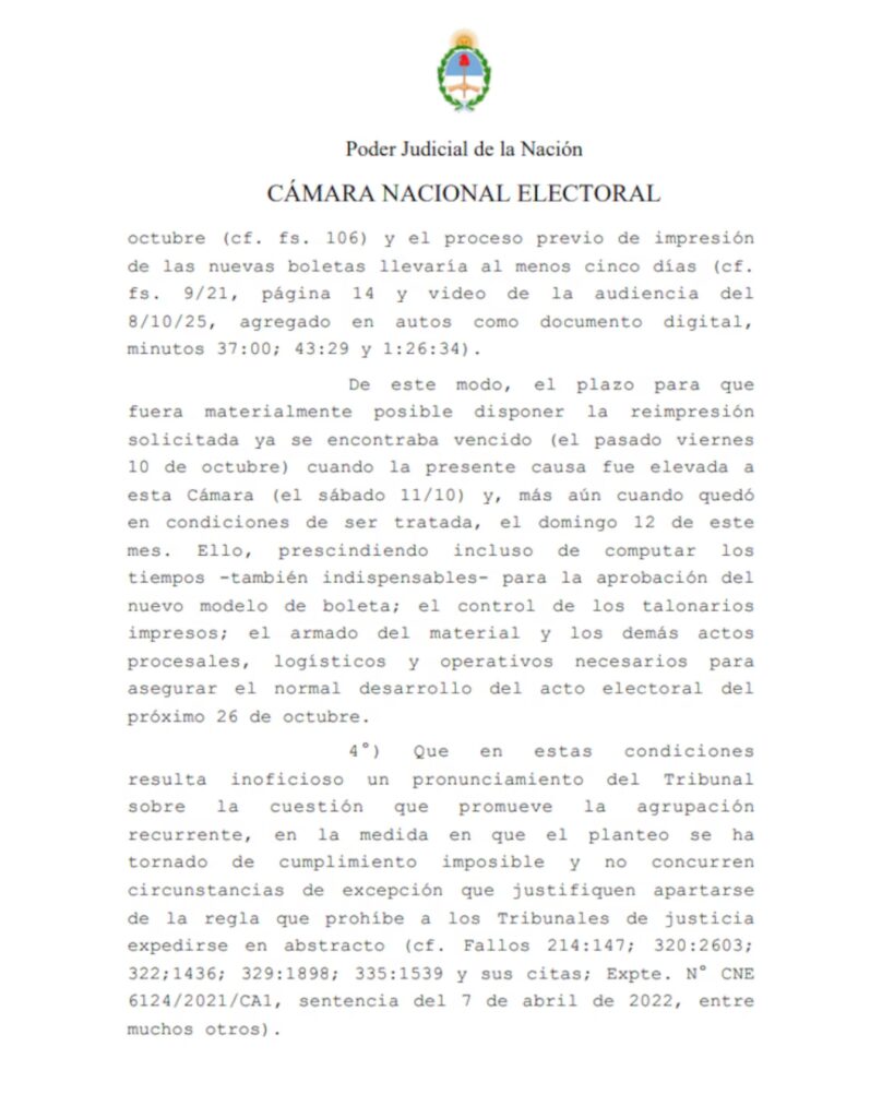 También recordaron que las normas electorales establecen plazos estrictos. Modificar las boletas a último momento generaría desigualdad entre los partidos.
