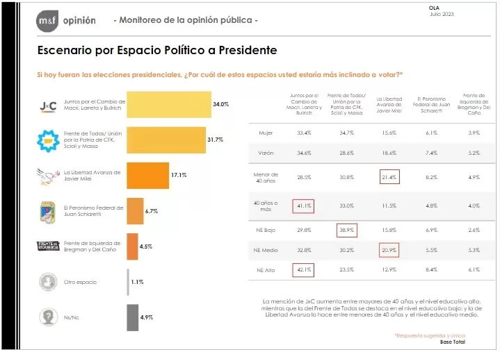 En el escenario nacional, Juntos por el Cambio se impondría como el frente más votado en las PASO, con el 34,0% de los sufragios, seguido por Unión por la Patria, con el 31,7%. El tercer lugar seria ocupado por la Libertad Avanza con un 17,1% y cuarto por el Peronismo Federal de Juan Schiaretti con un porcentaje de 6,7%.