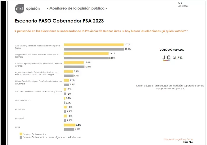 En la provincia de Buenos Aires, Axel Kicillof se perfila como el candidato más fuerte, con el 37,7% de la intención de voto. El mandatario provincial superaría ampliamente al candidato del Juntos por el Cambio, Santilli, quién alcanzaría el 28,2%. En tercer lugar se posiciona la Libertad Avanza con con el 12,5%. Esto implicaría un corte de boleta masivo de seis puntos a favor de Kicillof.