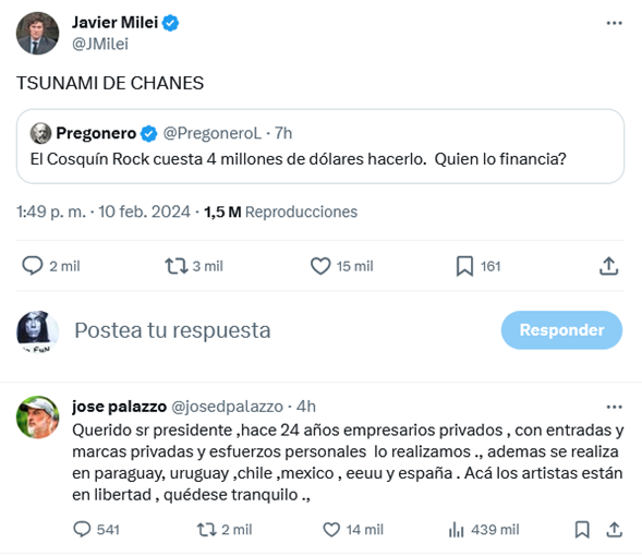 También, el libertario criticó el festival que se realiza hace muchos años en el interior de la provincia de Córdoba. Un usuario en X se preguntó quién financia “Cosquín Rock”, y Milei respondió de manera irónica “tsunami de chanes”, haciendo referencia a que Llaryora ponía el dinero. Sin embargo, inmediatamente le respondió el organizador histórico del evento, aclarando que los fondos para la financiación son privados.