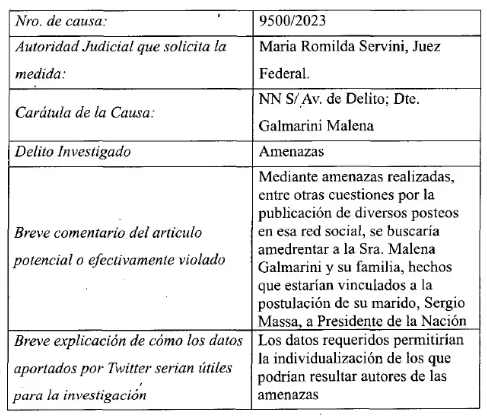 La presidente de Agua y Saneamientos Argentinos, Malena Galmarini, presentó denuncias ante la Justicia contra Christian Sanz y un grupo de usuarios de la red social X. Se alega que hubo una “conspiración” contra Sergio Massa, y que estaría organizada por Macri con el fin de ensuciar a su familia.