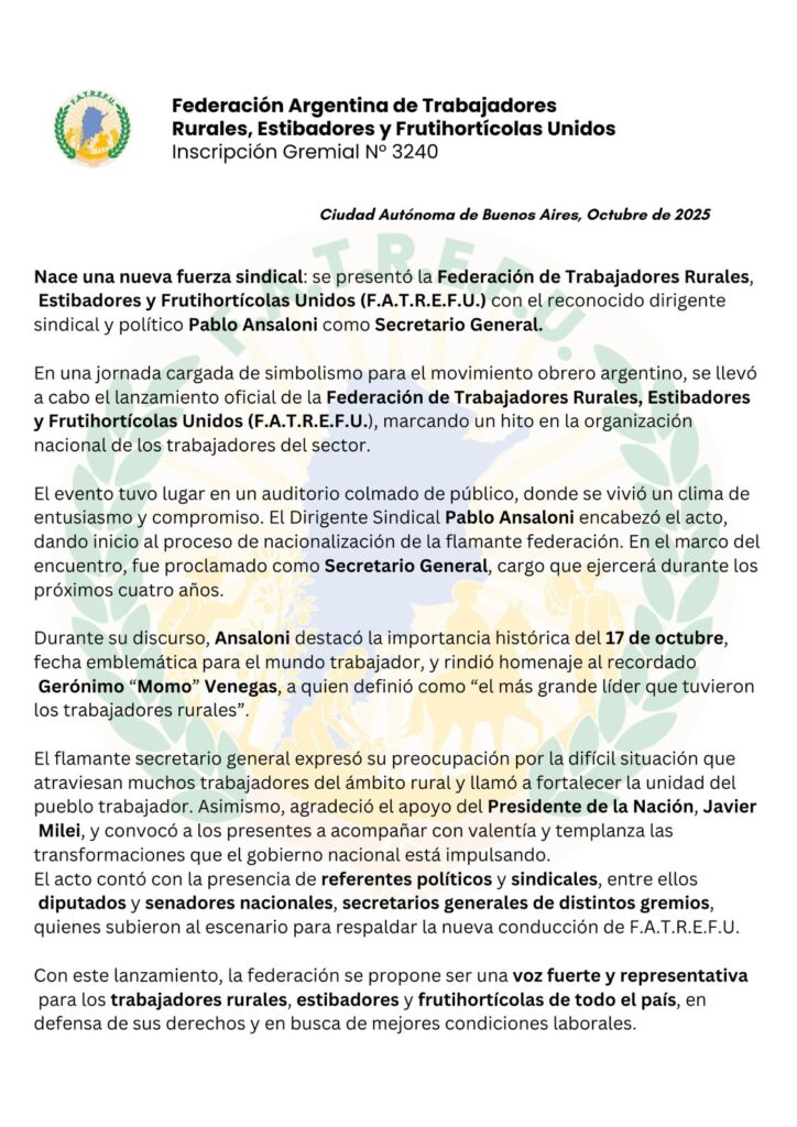 Se presentó oficialmente la Federación de Trabajadores Rurales, Estibadores y Frutihortícolas Unidos (F.A.T.R.E.F.U.), encabezada por el dirigente Pablo Ansaloni, quien asumió como Secretario General de la nueva organización que cuenta con el guiño de Javier Milei. El acto se desarrolló en la Ciudad Autónoma de Buenos Aires, con una amplia convocatoria de dirigentes sindicales y políticos.