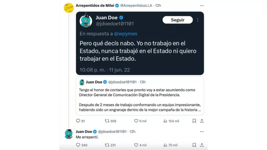Popularmente conocido en X como Juan Doe (@jdoedoe101101), Carreira ya es parte del gobierno nacional. La noticia la dio a conocer él mismo desde su cuenta, y Manuel Adorni, lo confirmó luego. «Felicitaciones y bienvenido», le respondió el vocero presidencial.