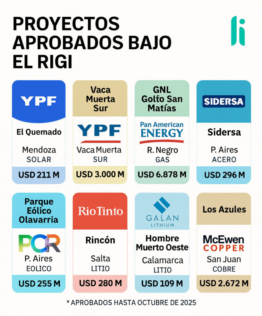 Hasta octubre de 2025, el Gobierno aprobó oficialmente ocho proyectos bajo el RIGI. Entre ellos se encuentran El Quemado (YPF Luz), Vaca Muerta Sur (YPF y socios), GNL Golfo San Matías (PAE y Golar), Sidersa (acero), Parque Eólico Olavarría (PCR y Acindar), Rincón (Rio Tinto), Hombre Muerto Oeste (Galan Lithium) y Los Azules (McEwen Copper). En conjunto, suman más de 15.700 millones de dólares en inversión directa en sectores estratégicos para la Argentina. Son las primeras apuestas formales en el régimen que el Gobierno considera su plataforma estrella para el “shock de productividad”.